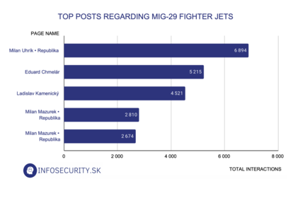 Since the situation surrounding the MiG-29 jets donation to Ukraine was one of the biggest topics in Slovak information space in the past two weeks, we also looked at it through an optic of a list of disinformation actors in Slovakia. We used the CrowdTangle analysis tool to analyse the most popular posts on Slovak Facebook that include the keywords “MiG-29“ and “stíhačky“ (“fighter jets“). Posts were evaluated based on the total number of interactions (the sum of all reactions, comments, and shares).
