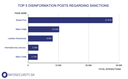 As we identified sanctions on Russia as a prevalent topic of disinformation narratives in Slovakia, we decided to look at the issue through the CrowdTangle analysis tool. The graph below shows the most popular posts on Slovak Facebook. Posts were evaluated based on the total number of interactions (the sum of all reactions, comments, and shares). In the analysis, we filtered only the posts containing the keyword sankcie (“sanctions” in English).