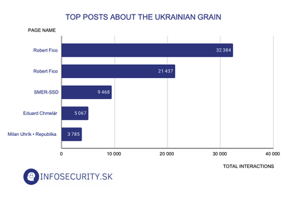 Since the Ukrainian grain has been one of the major topics in Slovak information space in the past two weeks, we also looked at it through an optic of a list of disinformation actors in Slovakia. We used the CrowdTangle analysis tool to analyse the most popular posts on Slovak Facebook that include the keywords “Ukraine“, “Ukrainians” and “grain”. Posts were evaluated based on the total number of interactions (the sum of all reactions, comments, and shares).