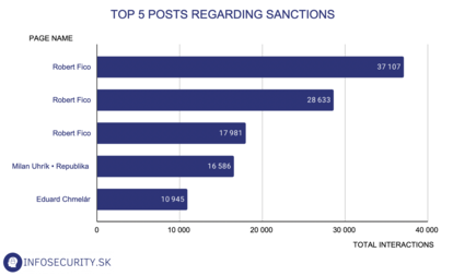 The graph below shows the most popular Facebook posts on the Slovak disinformation scene in the last two weeks. The posts were evaluated based on the total number of interactions (the sum of all reactions, comments, and shares). The analysis filtered posts with the keyword sankcie (sanctions in English).