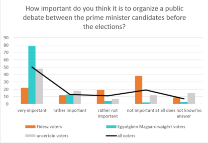 Taking a closer look at the two main competing alliances (see graph), there is a significant difference between the stance of the opposition voters towards the question and the voters of Fidesz. Whereas 92 % of opposition voters are in favour of the debate, only 34 % of the government supporters think the same.