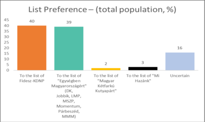 Not surprisingly, the strongest political formations are the ruling party coalition Fidesz-KNDP, supported by 40 % of total population, and the opposition alliance United for Hungary with the support of 39 %. These alliances are followed by smaller parties: a joke party "MKPP - Hungarian Party of the two-tailed dog" and a radical nationalist party "Mi Hazánk".
