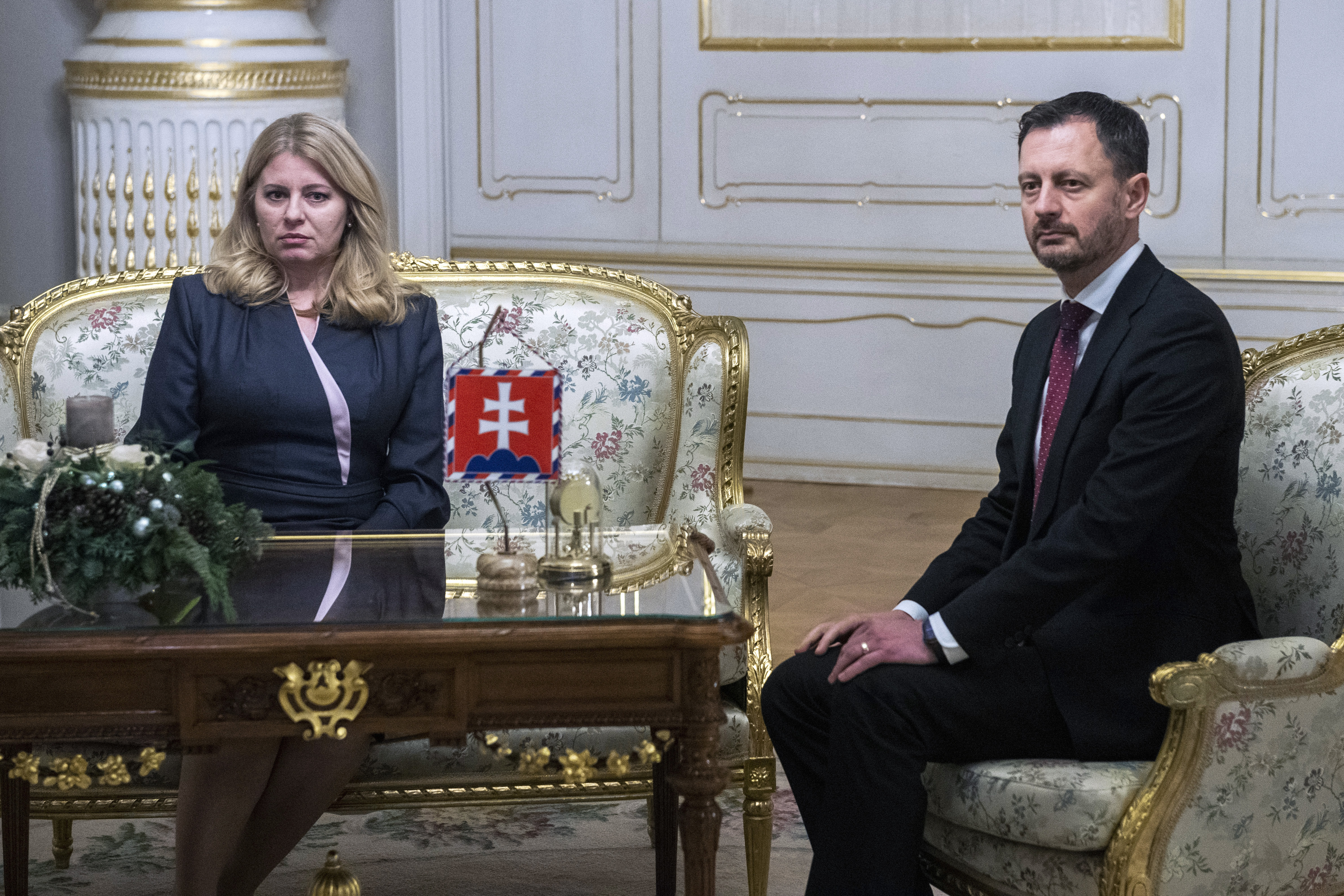 Slovak Prime Minister Eduard Heger meets Slovak President Zuzana Caputova after parliament passed a vote of no confidence in his government at the Presidential Palace in Bratislava