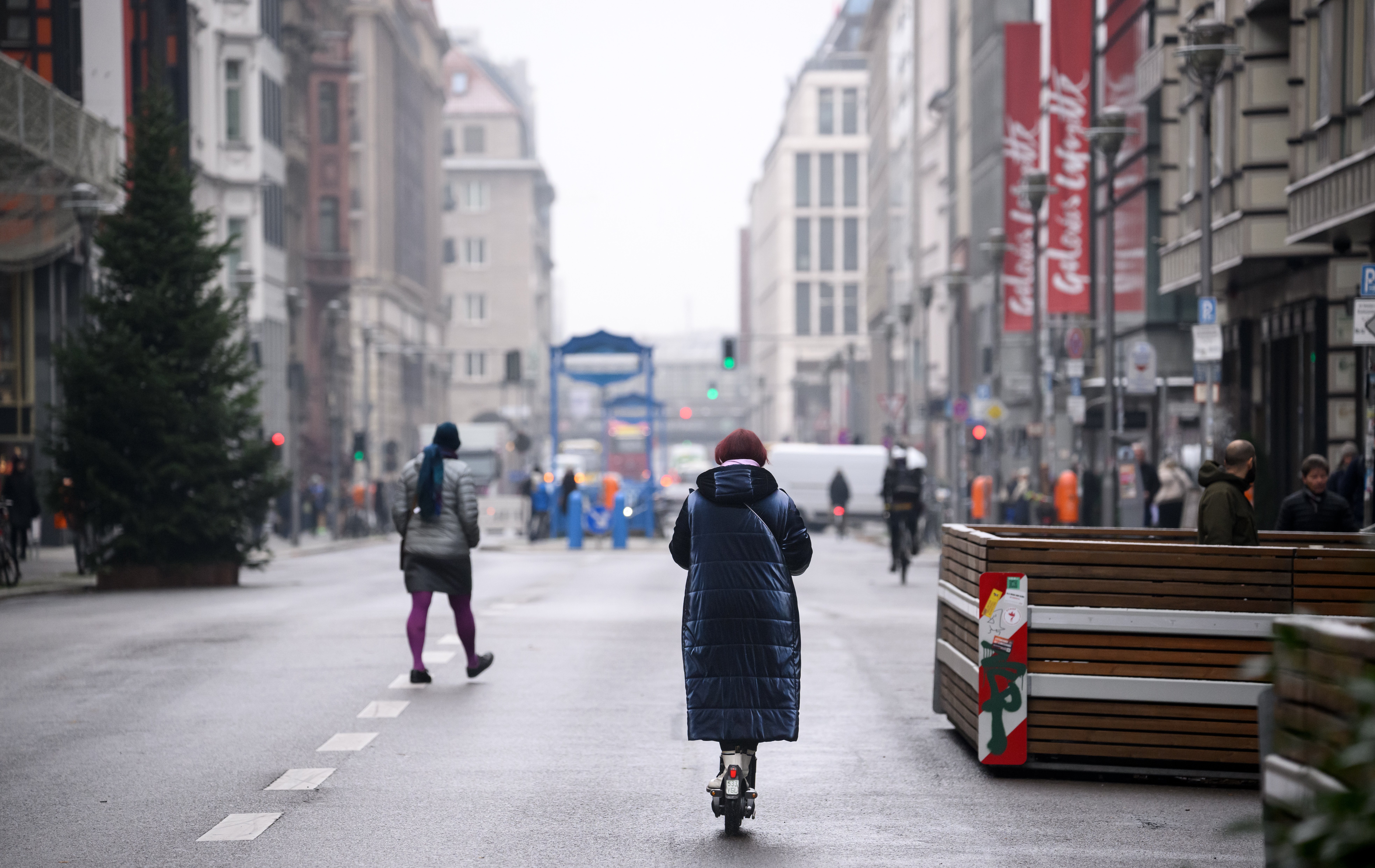 Fußgänger, Rad- und Rollerfahrer sind auf der Friedrichstraße in Berlin-Mitte unterwegs