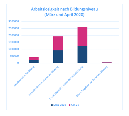 Noch ist nicht absehbar, welche Folgen die Coronakrise für das deutsche Bildungssystem haben wird. Die ersten Zahlen sind besorgniserregend. Ein Blick auf den Bestand der Arbeitslosenzahlen zeigt zum Beispiel, dass zwischen März und April auch überproportional viele Menschen mit einer akademischen Ausbildung arbeitslos geworden sind. Dennoch gilt nach wie vor, dass Bildung der beste Schutz vor Arbeitslosigkeit ist.
