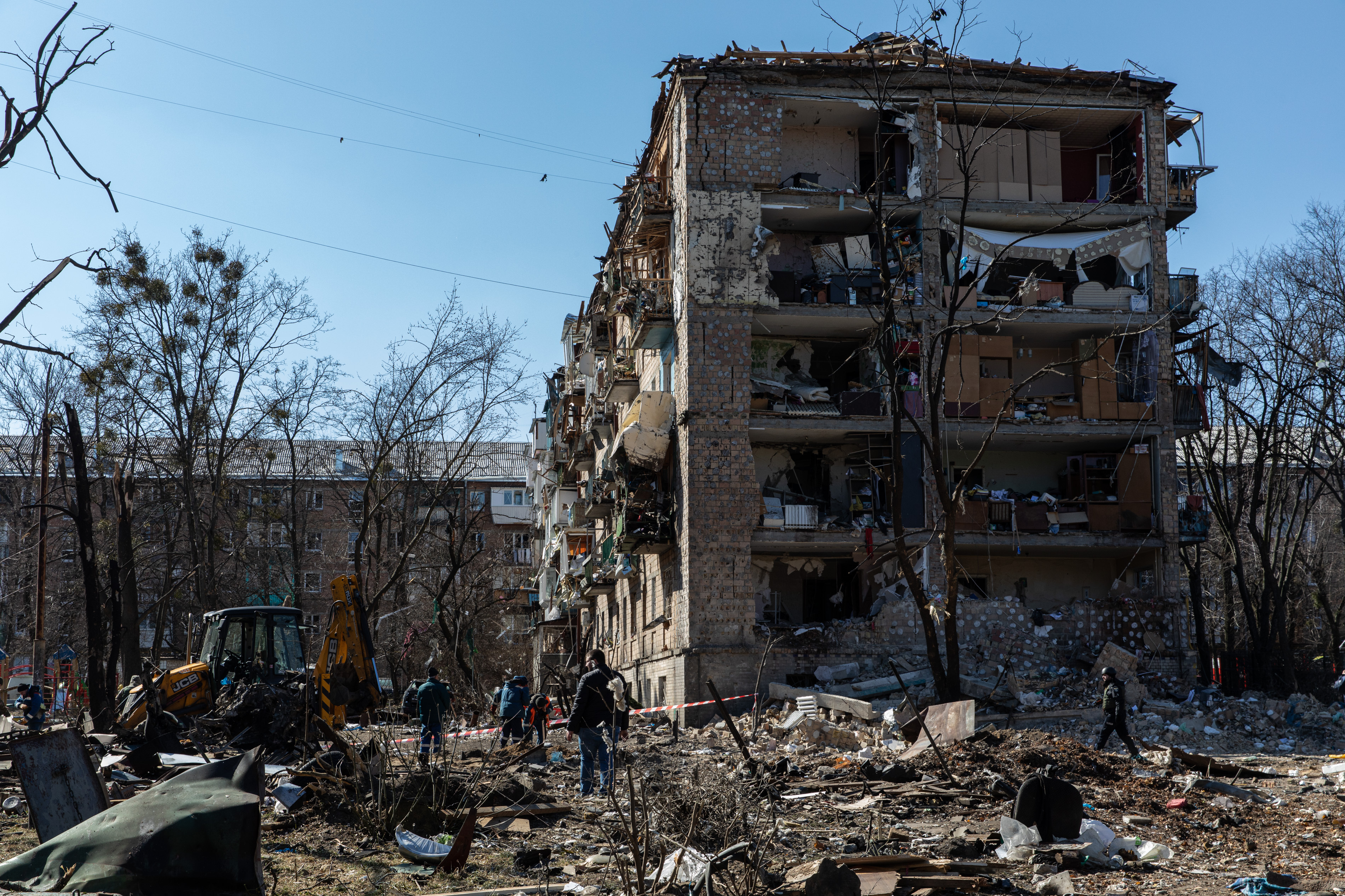 Ein durch einen russischen Raketeneinschlag zerstörtes Wohnhaus