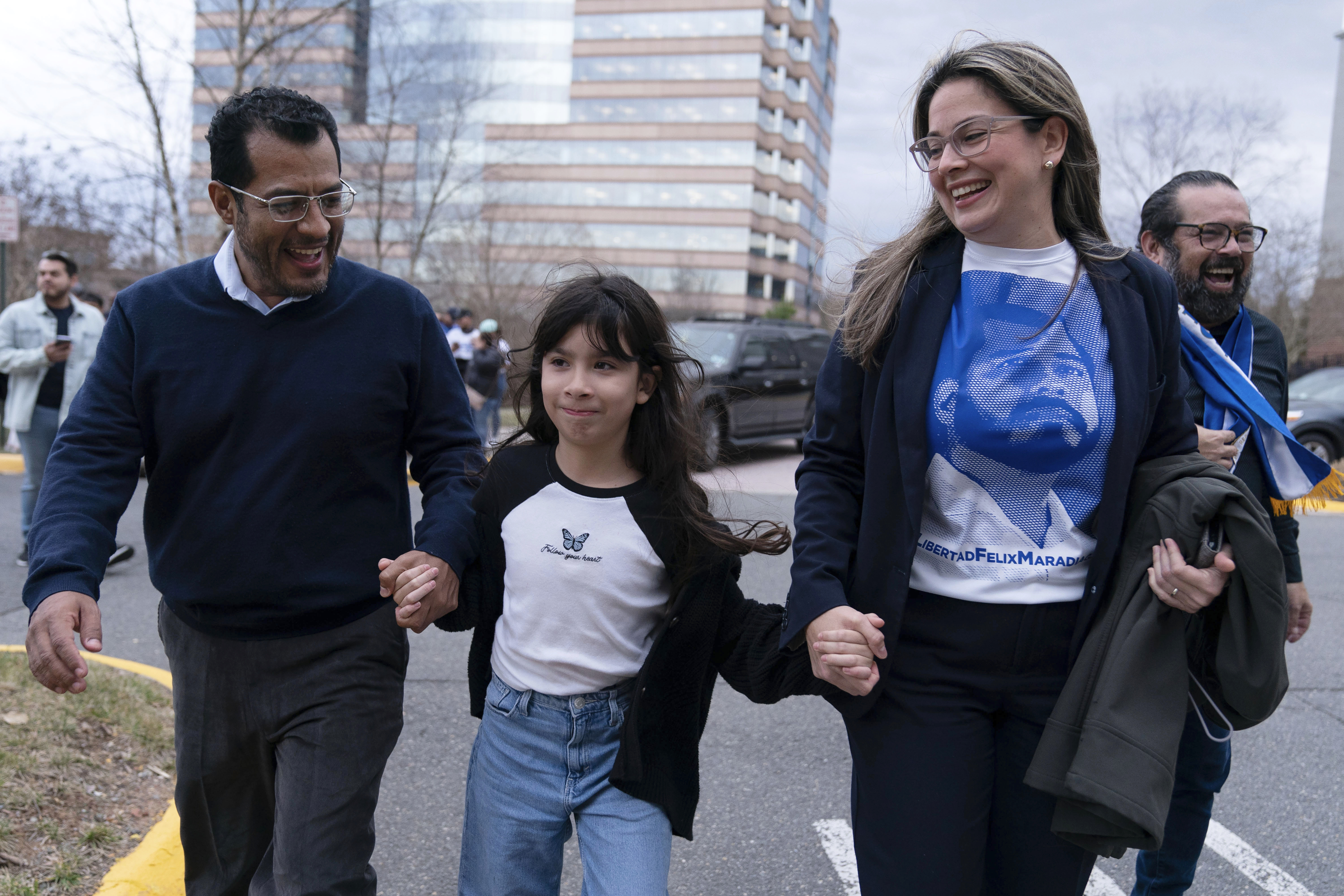 Former Nicaragua presidential candidate Felix Maradiaga reunits with his wife Berta Valle and his daughter Alejandra, walk together after Maradiaga arrived from Nicaragua