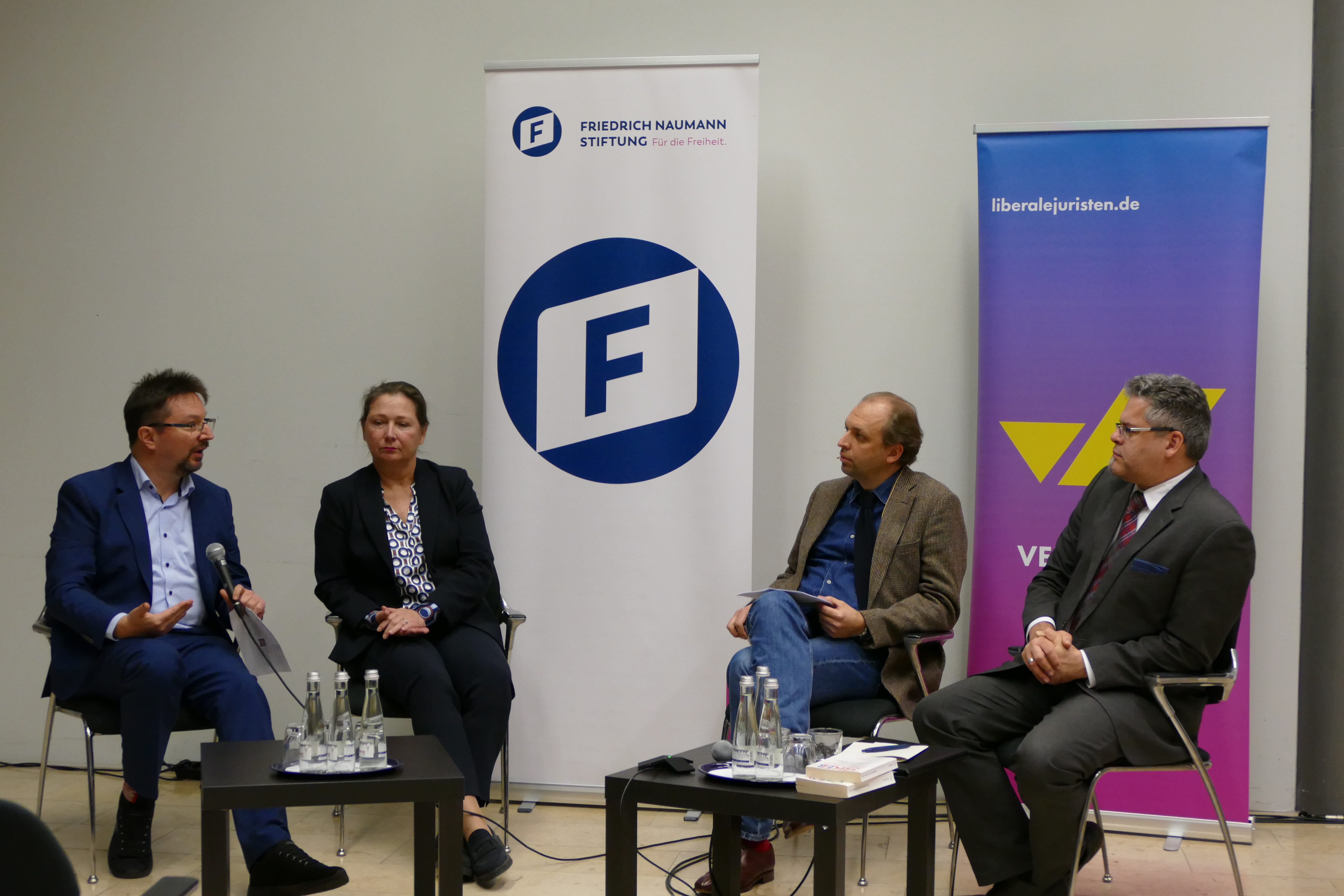 v.l.n.r.: Dr. Michael Blume, Beauftragter der Landesregierung Baden-Württemberg gegen Antisemitismus und für jüdisches Leben; Julia Goll, Mitglied des Landtages von Baden-Württemberg und innenpolitische Sprecherin der FDP/DVP; Dr. Max Bauer, Redakteur und Reporter der ARD-Rechtsredaktion und Generalbundesanwalt Jens Rommel.
