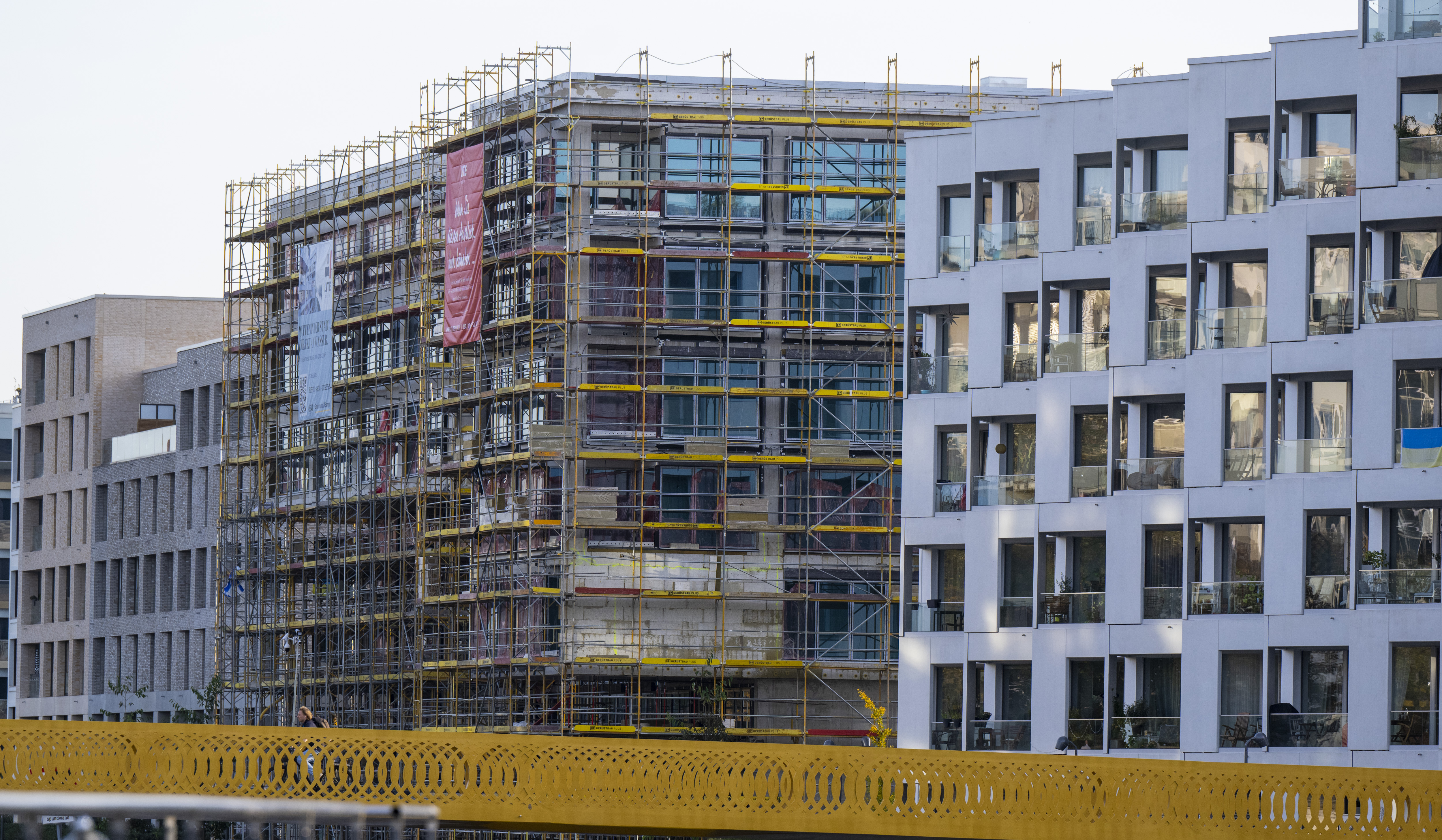 Ein Baugerüst steht an der Fassade von einem nicht fertig gebauten Wohnhaus auf einer Baustelle