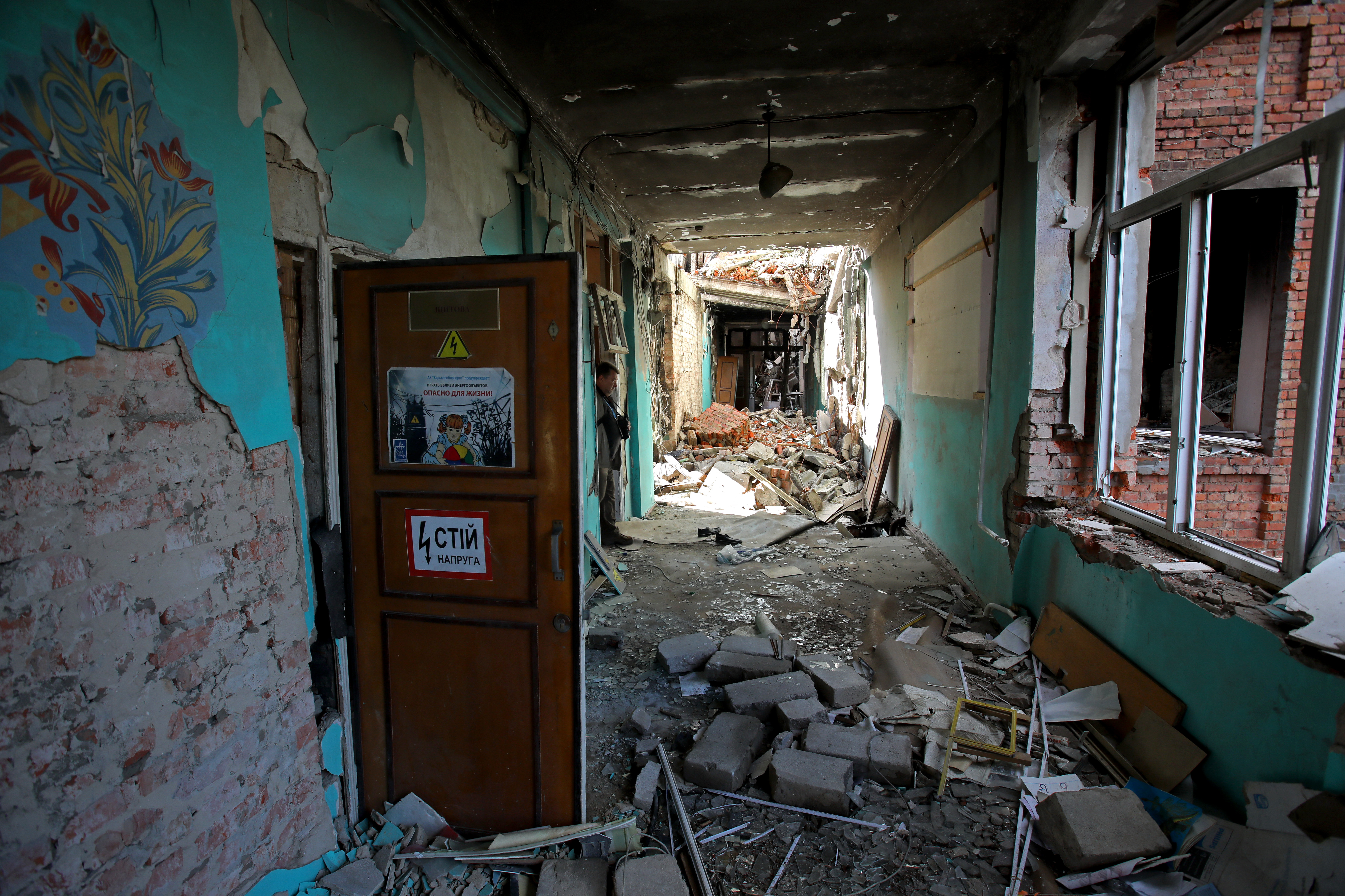 Ein Korridor im Inneren einer durch den Beschuss russischer Truppen zerstörten Schule