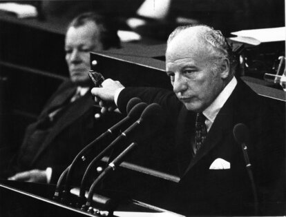 © ADL, Fotobestand FD-133, Foto: Jupp DarchingerNicht wenige politische Beobachter erwarteten an jenem 27. April 1972 den Kanzlersturz durch ein Konstruktives Misstrauensvotum im Deutschen Bundestag. Die Debatte verlief äußerst hitzig. Denn es stand der Vorwurf im Raum, die CDU/CSU-Fraktion wolle mit zwar legalen, aber nicht ganz legitimen Mitteln Willy Brandt als Kanzler stürzen. Nachdem als Folge des Abschlusses der Ostverträge bereits 1970 drei FDP-Abgeordnete zur CDU gewechselt waren und nun drei weitere Mandatsträger der FDP erklärten, sie würden gegen Brandt stimmen, war die seit den Wahlen von 1969 knappe parlamentarische Mehrheit der SPD-FDP-Koalition nicht mehr vorhanden. In der Hoffnung auf einen raschen Regierungswechsel stellte die CDU/CSU am 24. April 1972 den Misstrauensantrag, über den drei Tage später im Bundestag debattiert und anschließend abgestimmt wurde.