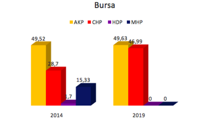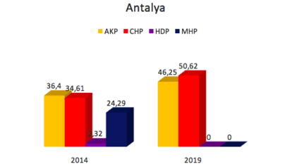 Künftig wird die CHP in mindestens zehn von insgesamt 30 Großstädten (in der Türkei gibt es insgesamt 81 Provinzen, 30 davon – mit jeweils mehr als 750.000 Einwohnern – werden als „Großstadt“ klassifiziert und genießen dementsprechend einen besonderen Status) das Sagen haben. Die Kemalisten, die auf der politischen Landkarte bislang nur in Thrakien und entlang der ägäischen Küste führend vertreten waren, haben sich auf der aktualisierten Wahlkarte nun auch ins Landesinnere und an die östliche Schwarzmeerküste gewagt. Kırşehir, Bolu, Bilecik, Burdur, Ardahan und Artvin, allesamt AKP-regierte Provinzen seit den letzten Kommunalwahlen 2014 und dementsprechend gelbgefärbt, sind nun auf der neuen Karte rot wiedergegeben.