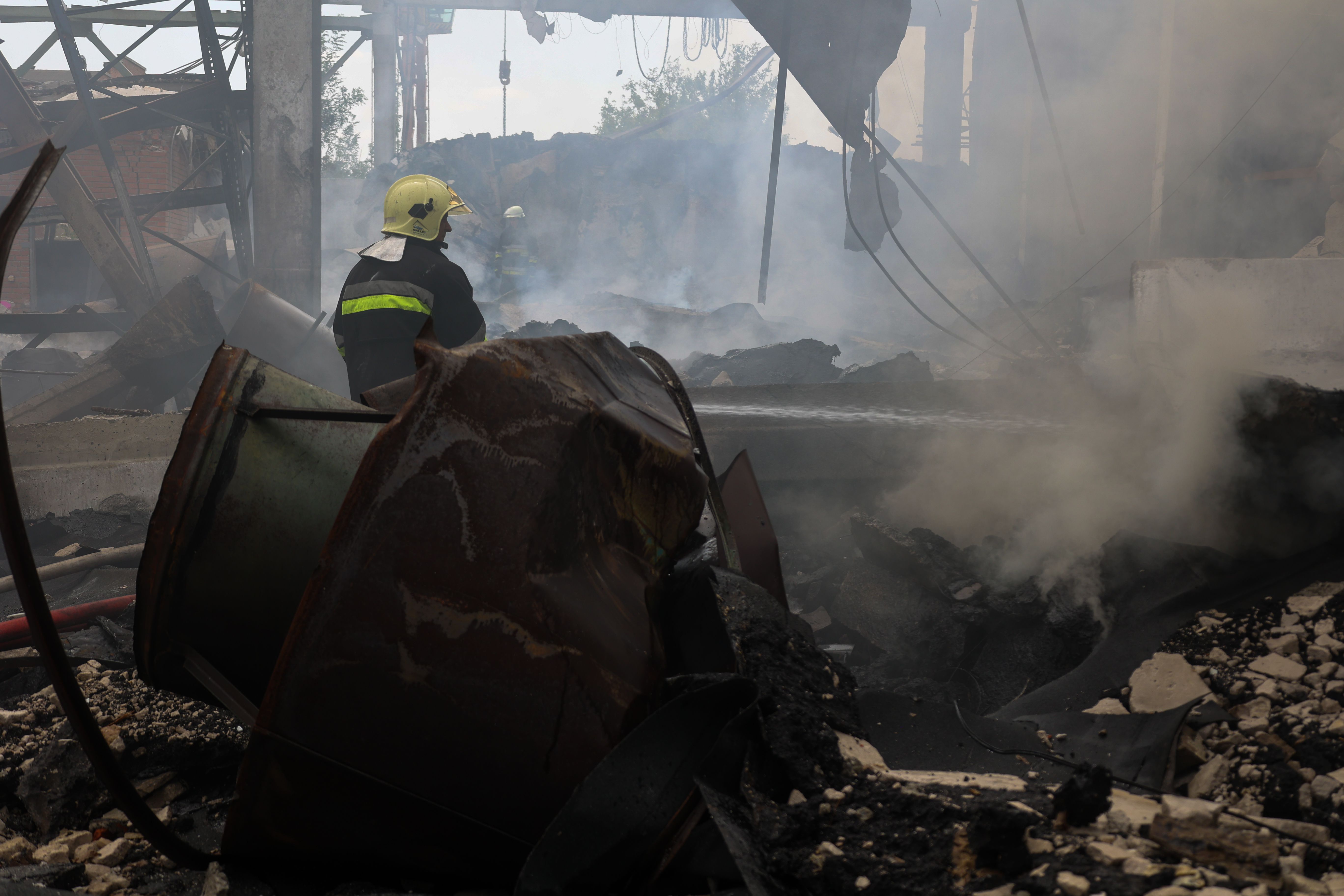 Rettungskräfte löschen einen Brand, der durch den Einschlag einer russischen S-300-Rakete auf einem Gelände in Charkiw verursacht wurde