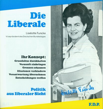 Fünf Jahre später, 1961, kandidierte Liselotte Funcke erfolgreich bei den Bundestagswahlen. Als Abgeordnete bewährte sich ihre berufliche Erfahrung als Wirtschaftsprüferin, indem sie Mitglied im Finanzausschuss wurde, dem sie 18 Jahre lang angehörte und davon sieben den Vorsitz führte. Wichtige Steuergesetze wie diejenigen über Mehrwert-, Einkommens-, Gewerbe- oder Erbschaftssteuer wurden unter ihrer professionellen Leitung beraten und beschlossen. Als persönlicher Referent stand ihr in den 1970er Jahren Hermann-Otto Solms zur Seite.