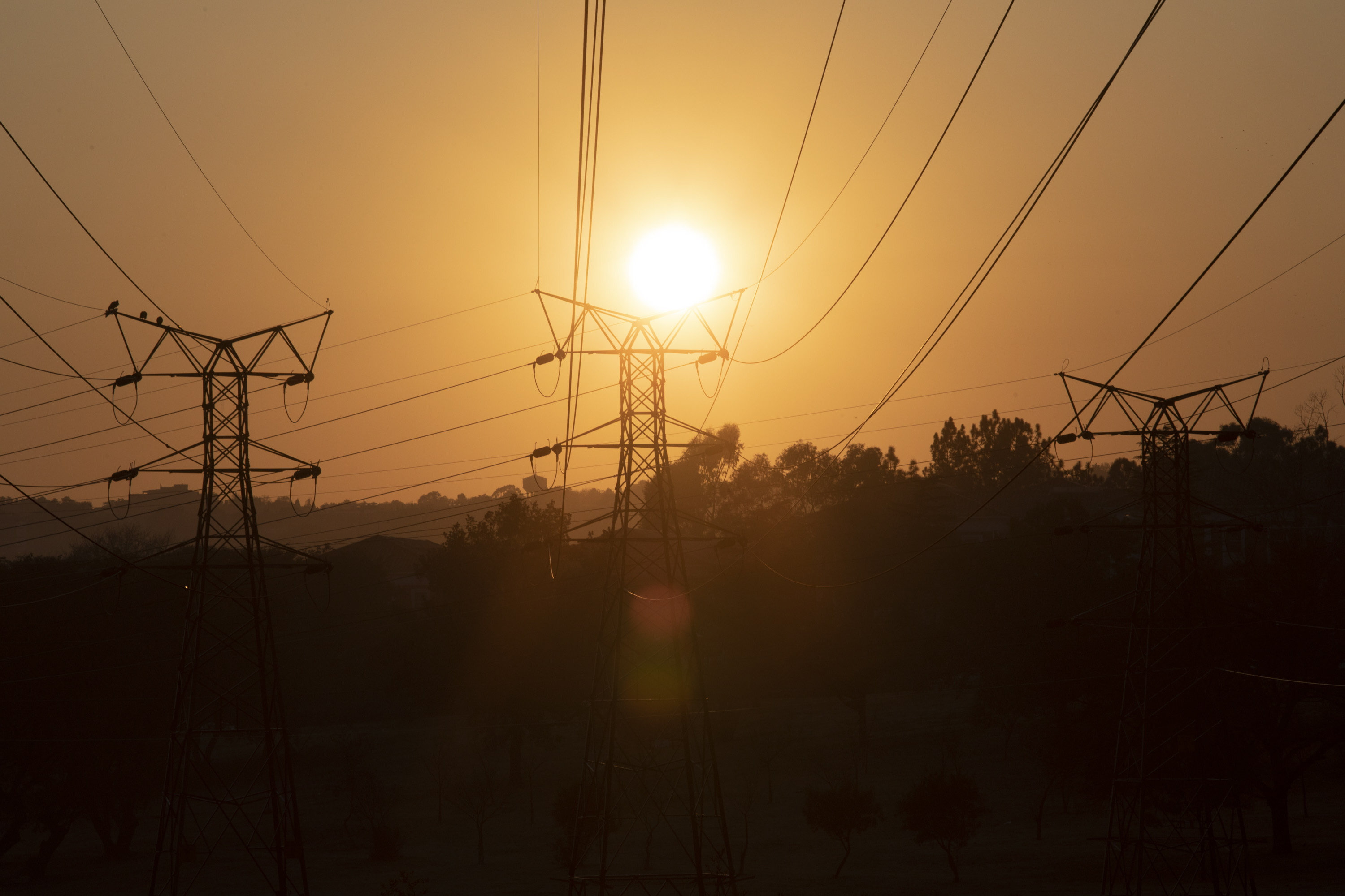 Stromleitungen, die vom staatlichen Stromversorger Eskom zum nationalen Netz führen, in Johannesburg, Südafrika