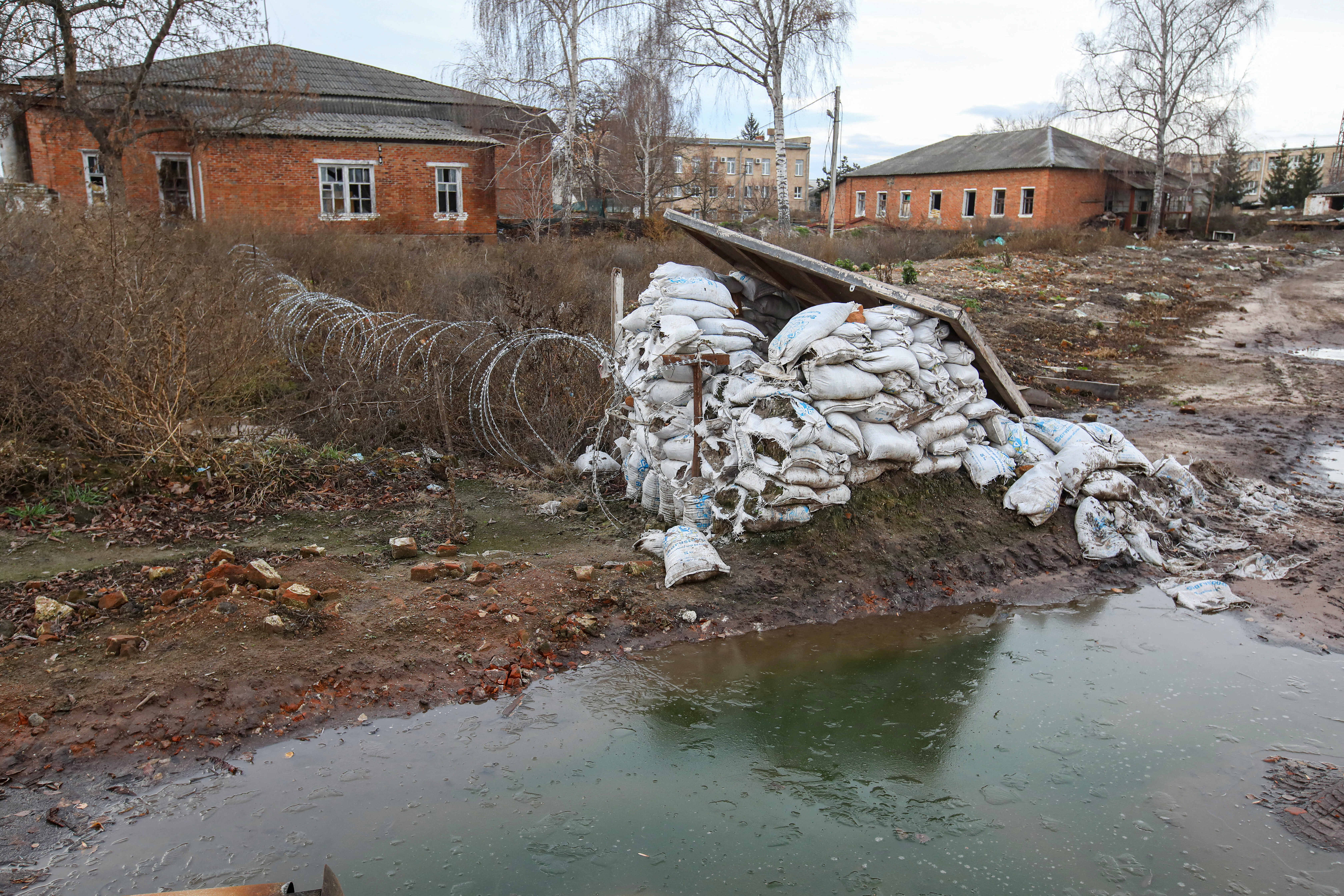 Durch russischen Beschuss beschädigte Gebäude im Zentrum des enteigneten Wowtschansk, wo derzeit Ermittlungsmaßnahmen durchgeführt werden, Region Charkiw, Nordosten der Urkaine.