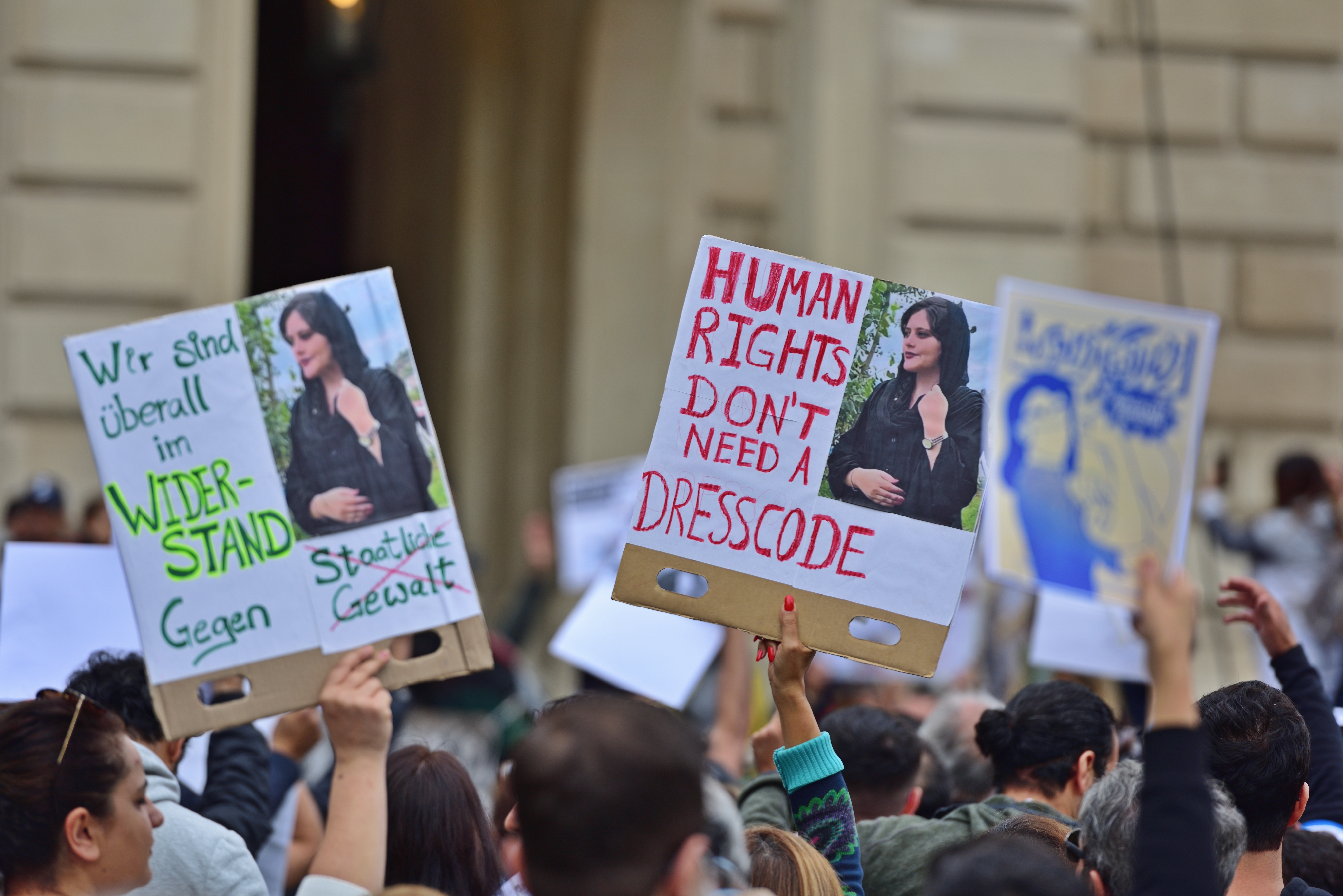 Protest in Frankfurt infolge des Todes von Mahsa Amini. An der Demonstration nahmen etwa 2000 Menschen teil. Die Teilnehmer und Teilnehmerinnen forderten mehr Menschenrechte, insbesondere für Frauen im Iran.