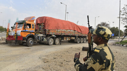 Ein indischer Soldat bewacht einen mit Weizen beladenen Lastwagen