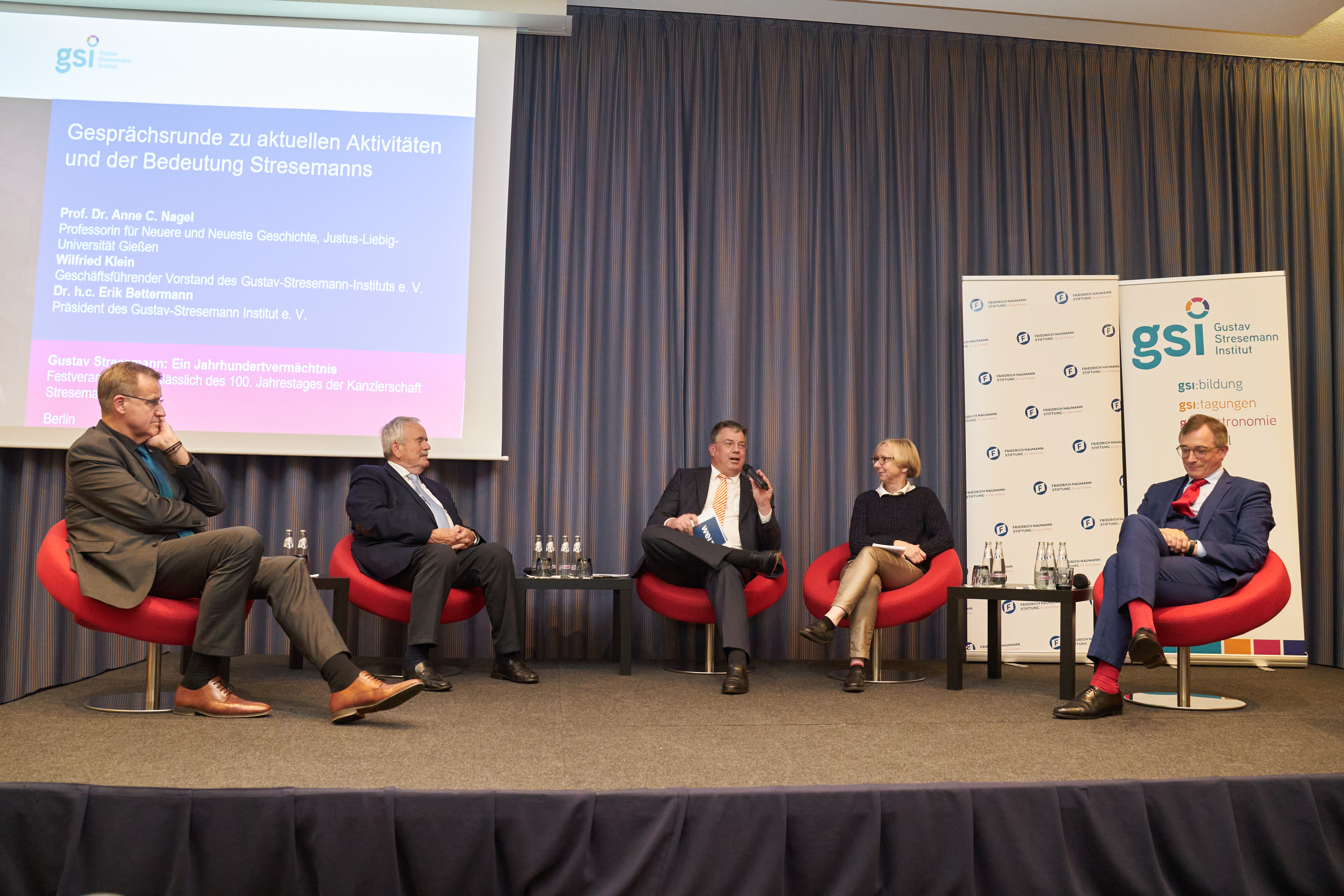 Wilfried Klein, Geschäftsführender Vorstand des Gustav-Stresemann-Instituts e. V., Dr. h.c. Erik Bettermann, Präsident des Gustav-Stresemann Institut e. V., Sven Felix Kellerhoff, Prof. Dr. Anne C. Nagel, Professorin für Neuere und Neueste Geschichte, Justus-Liebig-Universität Gießen und Prof. Dr. Andreas Rödder, Präsident der Stresemann-Gesellschaft e. V.