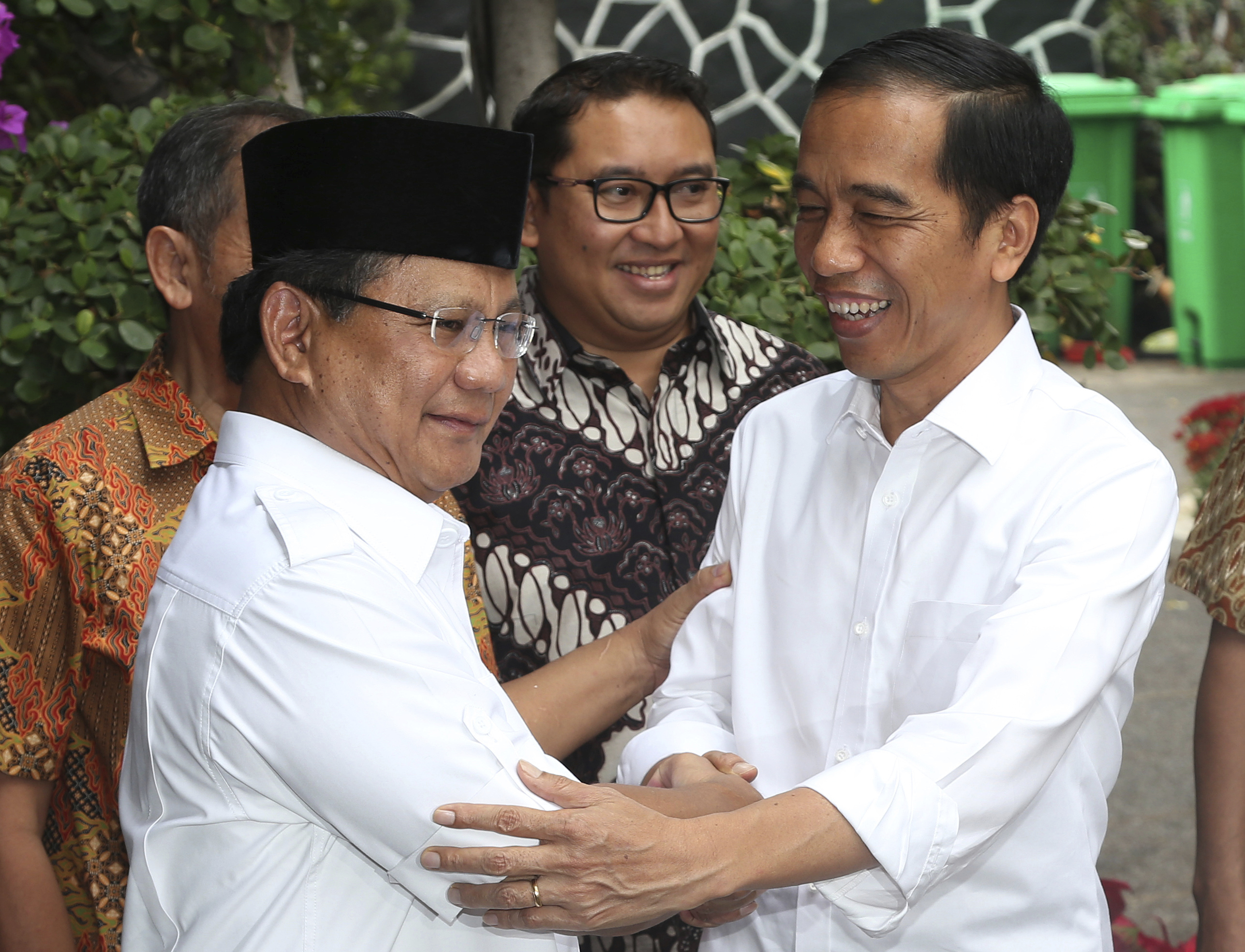 Indonesiens President Joko Widodo (rechts) grüßt seinen politischen Gegner Prabowo Subianto.