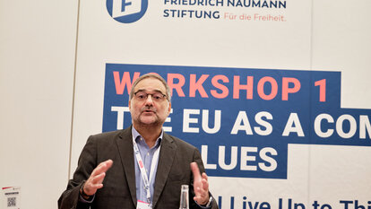 Im Anschluss an die Paneldiskussionen begaben sich die Teilnehmerinnen und Teilnehmer der Konferenz in verschiedene interaktive Workshops. Die Teilnehmerinnen und Teilnehmer beschäftigten sich u.a. mit der Frage, ob die EU ihrem eigenen Anspruch als Wertegemeinschaft gerecht wird. Die Europäische Union steht vor der Herausforderung, ihre Werte gegenüber autoritären Staaten besser zu verteidigen. Das andauernde Spannungsverhältnis zwischen demokratischen Ansprüchen und der Abhängigkeit zu menschrechtsverletzenden Staaten, mache die EU in ihre Werteintegrität jedoch verletzbar.