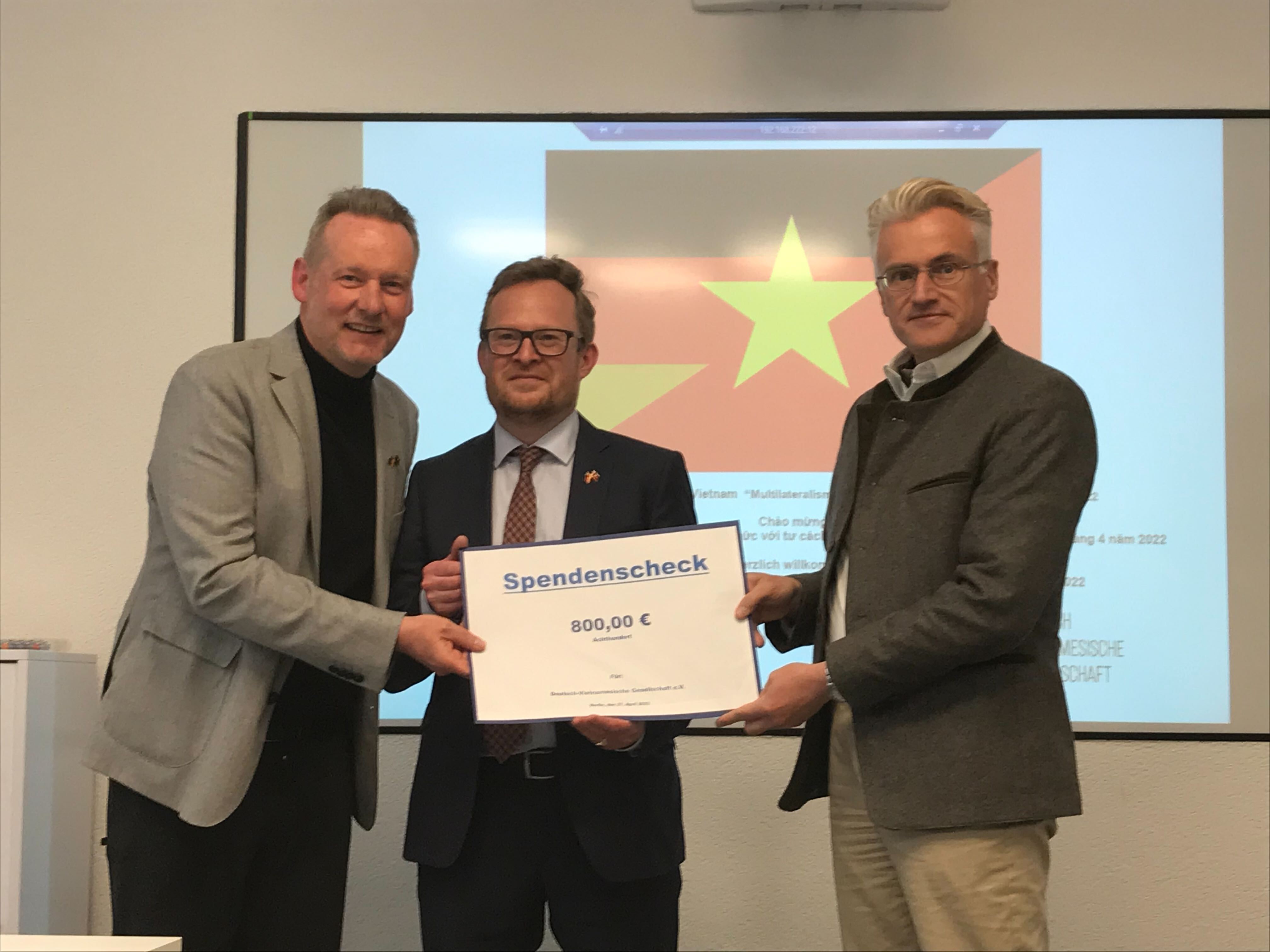 Das „Tüpfelchen auf dem i“ ist, dass Herausgeber und Autoren auf ihre Tantiemen zugunsten eines wohltätigen Zweckes verzichten. So konnte Andreas Stoffers am 27.4.2022 im Namen aller Beteiligten der Deutsch-Vietnamesischen Gesellschaft DVG e.V. in Berlin die aufgerundete Summe von 800€ übergeben.