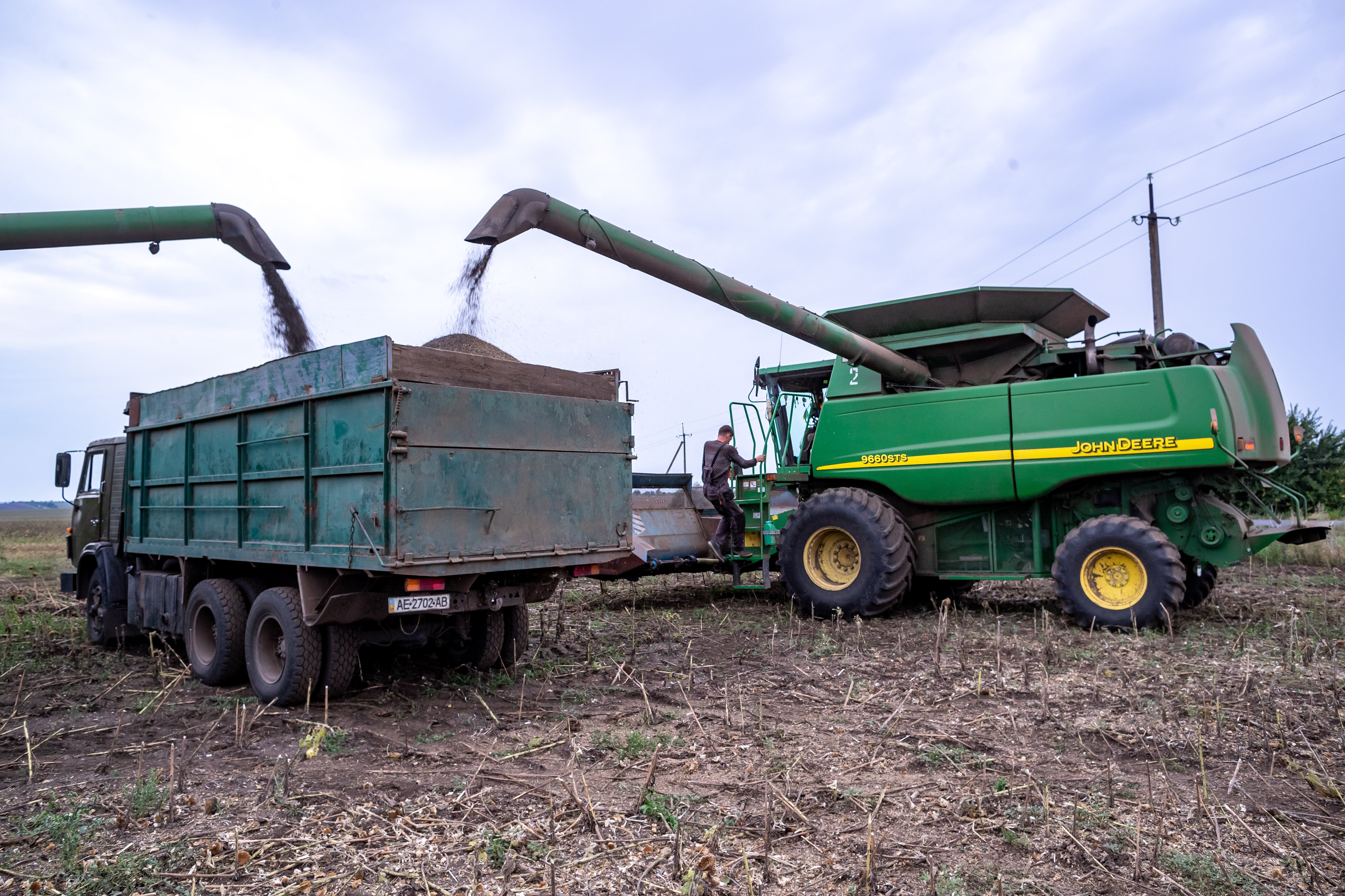 Ein ukrainischer Landwirt auf einem Mähdrescher entlädt geerntete Sonnenblumenkerne auf einen Lastwagen in der Nähe von Zaporiz'ke