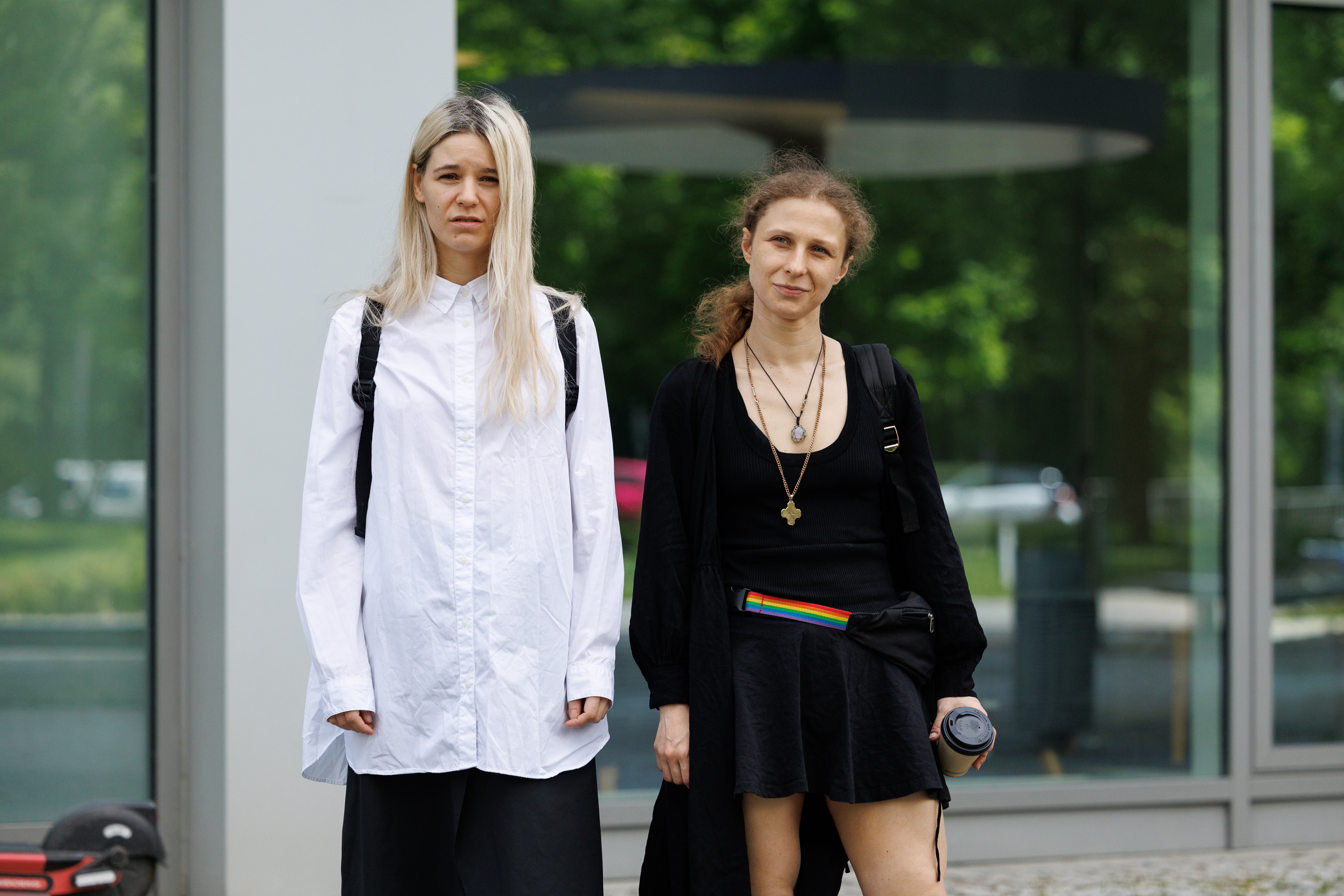 Diana Burkot (l) und Maria Aljochina (r), beide Aktivistinnen und Mitglieder der Gruppe Pussy Riot, vor der Pressekonferenz im Vorfeld eines Auftritts im Rahmen der «Riot Days 2022»