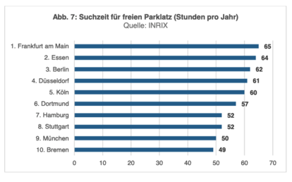 Beim Smart Parking handelt es sich um intelligente Parkraumlösungen. Hierbei werden Parkplätze mit Sensoren ausgestattet, die erkennen, ob der Parkplatz derzeit belegt ist. Diese Informationen können dann über eine Smartphone-App oder über digitale Verkehrszeichen verfügbar gemacht werden. Diese Technologie verringert nicht nur den Stress bei der Parkplatzsuche, sondern führt auch zu signifikanten CO2-Einsparungen. Aus der Antwort auf eine kleine Anfrage der FDP-Bundestagsabgeordneten Daniela Kluckert geht hervor, dass durch intelligente Parkraumlösungen bis zu 900.000 Tonnen CO2 pro Jahr eingespart werden können.61 Eine Studie von INRIX zeigt die deutschen Städte, in denen die Parkplatzsuche am längsten dauert (siehe Abbildung 7). Insgesamt befindet sich ein Autofahrer in Deutschland durchschnittlich 41 Stunden pro Jahr auf Parkplatzsuche.