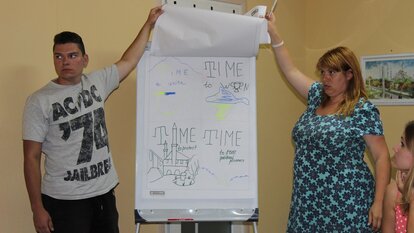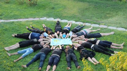 Am 27. Jahrestag der ukrainischen Unabhängigkeit nutzen die Teilnehmerinnen und Teilnehmer ihre freien Stunden für eine besondere Aktion: Mit ukrainischen und krimtatarischen Fahnen ziehen sie vor die Grenzlinie zum russisch okkupierten Gebiet, gratulieren der Ukraine zum Geburtstag