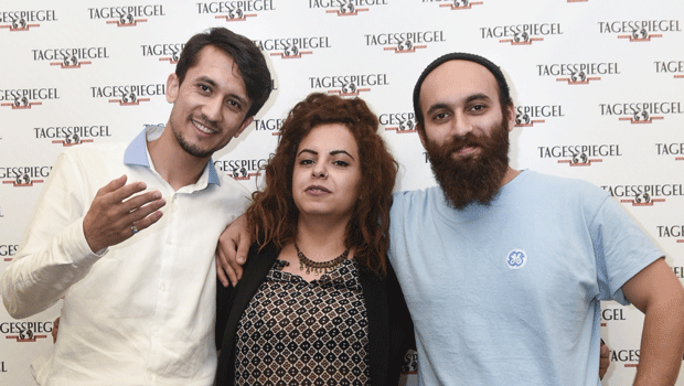 Auf Tagesspiegelseite leitete das Projekt die Journalistin Dorothee Nolte (r. im Bild), hier im Gespräch mit dem Illustrator der Beilage, Hamid Sulaimann (links) und seinem Verleger (Mitte).