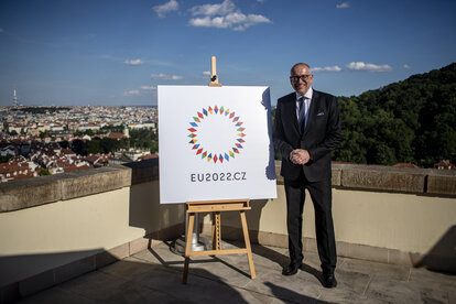 Der tschechische Minister für europäische Angelegenheiten Mikulas Bek neben dem offiziellen Logo der tschechischen EU-Ratspräsidentschaft