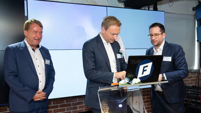 Um diese zwei Welten zu vereinen, wurde der Global Innovation Hub nicht wie üblich mit Schere und rotem Samtband eröffnet, sondern digital – mit einem Code. Das Team des GIH hatte zuvor eine Art HTML-Code geschrieben, der von Christian Lindner, Moritz Kleine-Brockhoff, Armin Reinartz und Generalkonsul Dieter Lamlé vervollständigt wurde. „Wir wollten so zeigen, dass wir online und offline verbinden können“, erklärte Armin Reinartz.