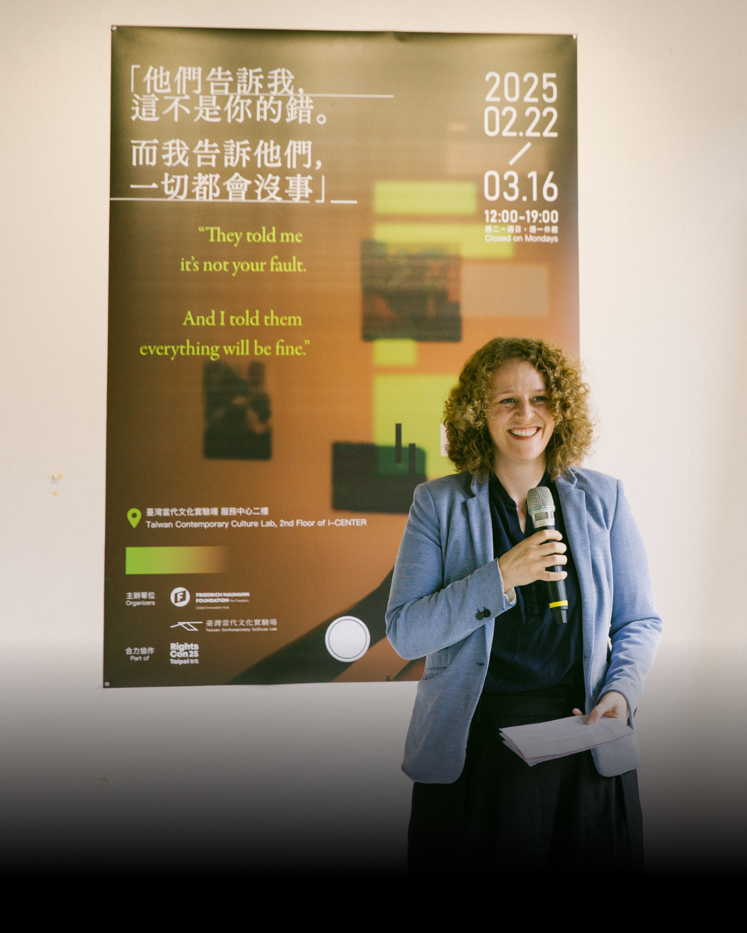 Anna Marti, Leiterin FNF Global Innovation Hub in Taiwan, eröffnet die Ausstellung auf der RightsCon 2025