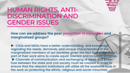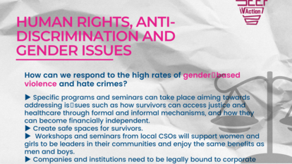 Zu den Themen, die die Teilnehmer diskutierten und die sie zu den endgültigen politischen Vorschlägen führten, gehörten auch der EU-Aktionsplan für Menschenrechte (2020-2024), die steigende Zahl von Femiziden und geschlechtsspezifischer Gewalt, die gesellschaftlichen und wirtschaftlichen Ungleichheiten für Randgruppen der jeweiligen Gesellschaften und die Rechte von Minderheiten.