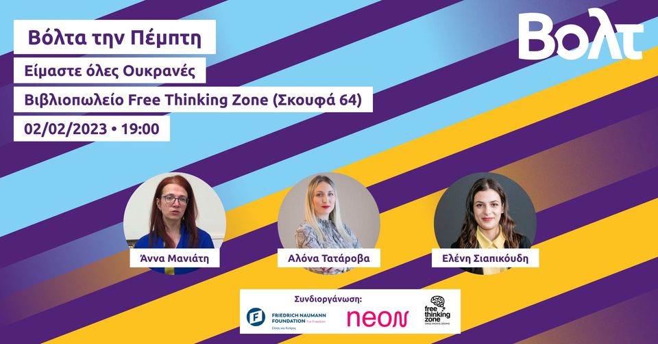 Volt Greece, die Buchhandlung Free Thinking Zone und das NEON-Projekt haben mit Unterstützung der Friedrich-Naumann-Stiftung für die Freiheit in Griechenland und Zypern eine Diskussion über die Geschehnisse des letzten Jahres in der Ukraine, über die Bürger dort und darüber, was dieser Krieg für Griechenland, für jedes demokratische Land, für jeden Menschen, für die liberale Demokratie und für die Freiheit bedeutet, organisiert.