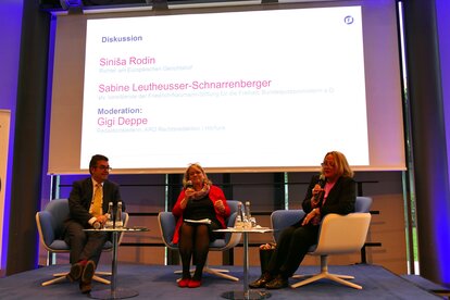 Richter Siniša Rodin vom Europäischen Gerichtshof und Sabine Leutheusser-Schnarrenberger, stellvertretende Vorstandsvorsitzende der Friedrich-Naumann-Stiftung und Bundesjustizministerin a.D. auf der Podiumsdiskussion