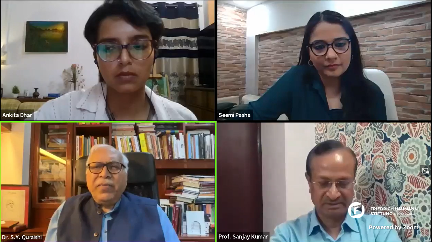 FNF Südasien lud daher am 16. April Experten zu einem Webinar ein, um über Schlüsselthemen wie dem Wahlverfahren und der Beteiligung von Frauen, Erstwählern und Minderheiten zu diskutieren. Das Webinar wurde in Zusammenarbeit mit der Partnerorganisation SMART (Seeking Modern Applications for Real Transformation) und dem FNF Büro in Nordrhein-Westfalen organisiert. Mit Dr. S. Y. Quraishi, dem ehemaligen Chief Election Commissioner von Indien; Prof. Sanjay Kumar, Professor und Co-Direktor bei Lokniti, einem Forschungsprogramm am Center for the Study of Developing Societies und Frau Ankita Dhar Karmakar, Multimedia-Journalistin bei Behanbox konnte FNF Südasien sehr unterschiedliche Fachleute und Meinungen für das Panel gewinnen. Ankita Dhar Karmakar berichtet vor allem über die Probleme, denen Minderheiten sich gegenüber sehen. Dr. Quraishi gab interessante interne Einblicke und Begründungen zur Arbeitsweise und zu Entscheidungen der Wahlkommission, während Prof. Kumar zu Wahlpolitik, indischer Jugend, Demokratie und Wahlgewalt forscht und dazu Umfragen erhebt.