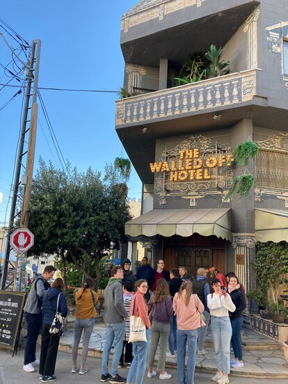 Im Anschluss gehen wir in das von Banksy designte Walled Off Hotel. Dort besuchen wir das Museum zur israelischen Mauer und eine Ausstellung mit Kunst aus dem Gaza-Streifen.