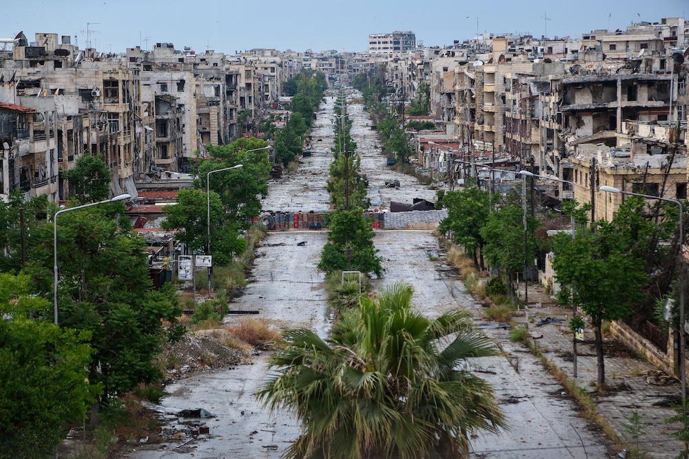 Eine zerstörte Straße im Saif al-Dawla Viertel in Aleppo, mit Sandsäcken als Barrikaden. Die Straße lag an der Frontlinie, eine Hälfte von Oppositionskräften kontrolliert, die andere von Kräften des Assad Regimes. Aufgenommen am 11. Mai 2015. Foto von Hosam Katan.
