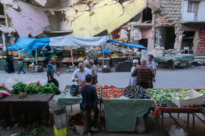 Menschen kaufen Obst und Gemüse ein auf einem Markt, der von einem Luftangriff des Regimes getroffen wurde. Busan al-Qasr Viertel. Aufgenommen am 14. Oktober 2015. Foto von Hosam Katan.