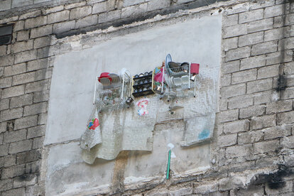 Küchenutensilien hängen im Freien, nachdem ein Haus im al-Myassar Viertel in Aleppo von einer Fassbombe des Regimes zerstört wurde. Aufgenommen am 09. Februar 2014. Foto von Hosam Katan.