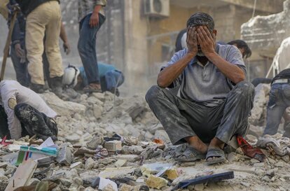 Die Reaktion eines Mannes auf die Zerstörung, die eine Fassbombe des Regimes im al-Shaar Viertel in Aleppo angerichtet hat. Aufgenommen am 27. April 2014. Foto von Hosam Katan.