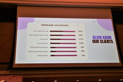 Statistics of clients who sought Telenisa's legal services throughout 2023: housewife (26%), support staff (24%), professional (17%), others (14%), unemployed (8%), self-employed (8%), student (3%).