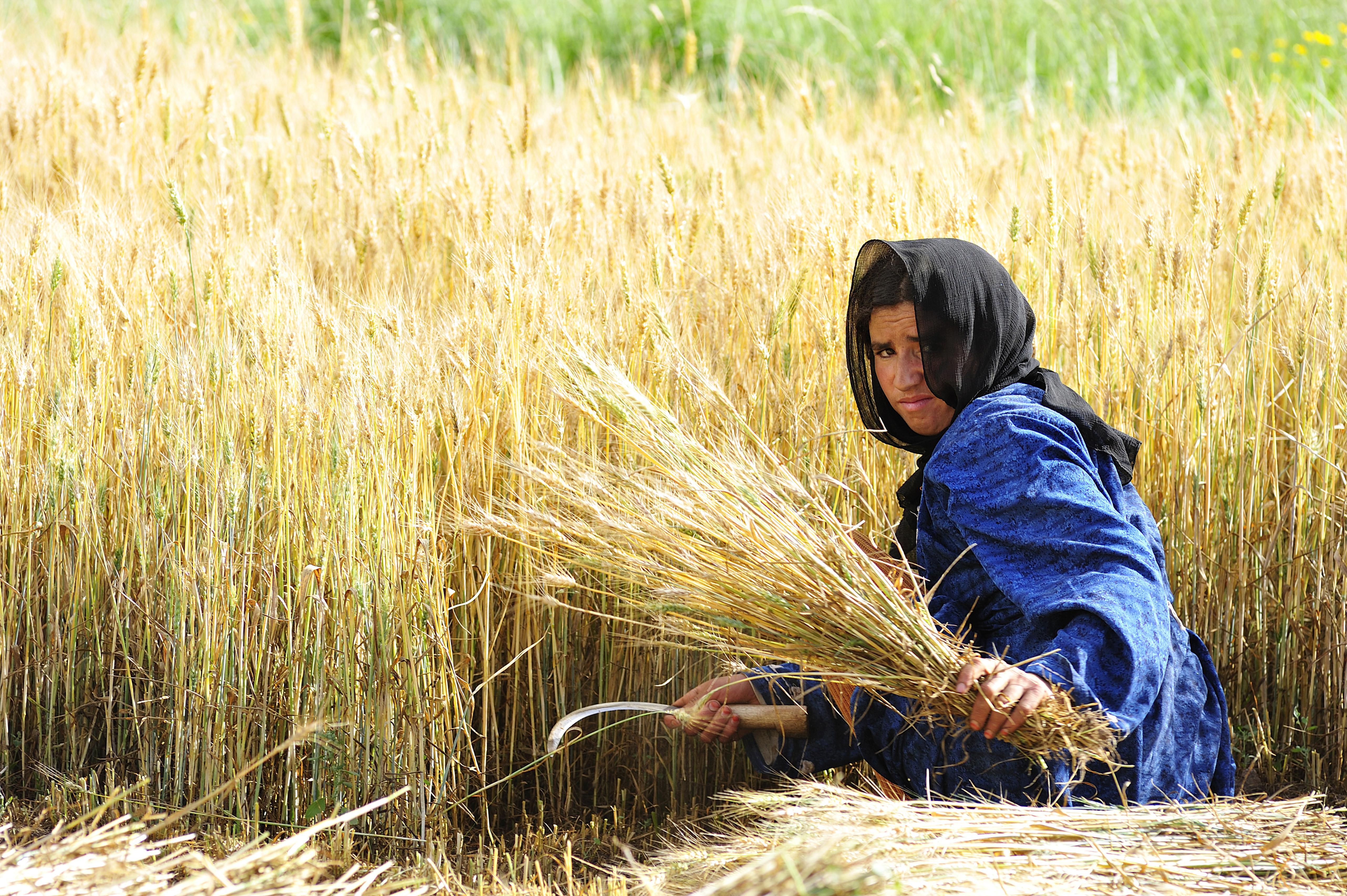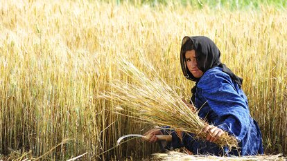 Frau erntet auf ihrem Feld mit einer Sichel Getreide