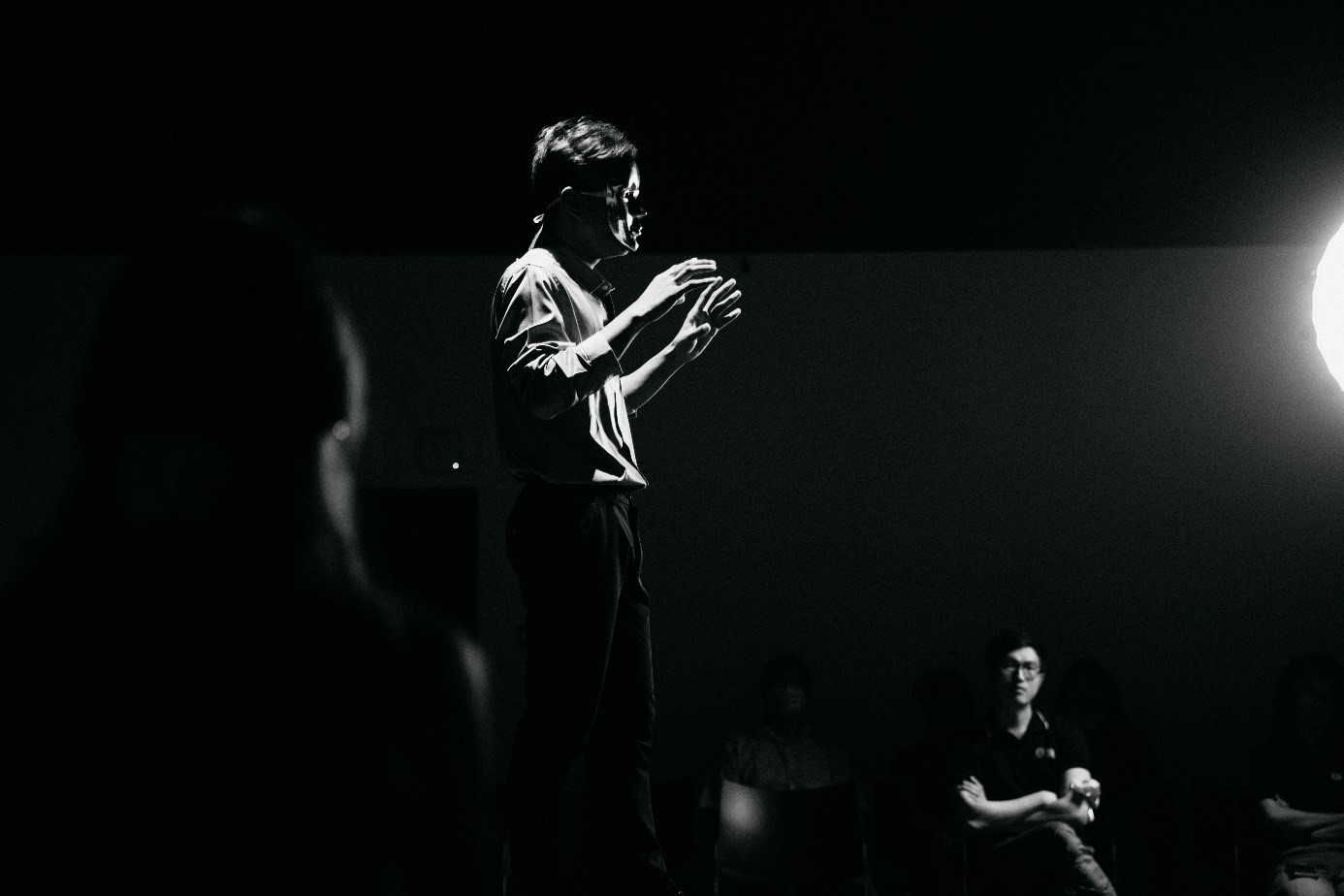 Teilnehmer von “Open Mic” 2022, der mit einer Maske auftritt, um anonym sprechen zu können.