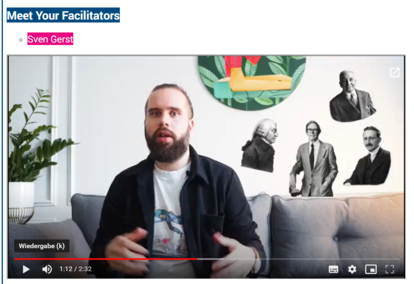 Since our participants live in different time zones, we set up regional working groups on the gamer platform/app Discord for example. Here, participants can get together at any time texting or via voice/video chat or contact the facilitators with questions. Tasks are explained either in the plenary or by means of entertaining video messages from the seminar facilitators. Working group results can be shared with the others in the cloud as documents, videos or slides; or they can be summarized by graphic recording.