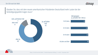 85 Prozent der Befragten gehen davon aus, dass nach der Wahl Donald Trumps mehr Lasten von Deutschland in der NATO und beim Thema Verteidigung übernommen werden müssen. Das Ergebnis ist auch deswegen so eindeutig, weil Trump in der Vergangenheit diese Forderung bereits mehrfach aufgestellt hat. Allerdings gilt dies auch für seine Vorgänger im Amt seit Barack Obama.