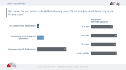 Bei der Frage nach dem künftigen Engagement der USA zur Unterstützung der Ukraine haben die Befragten eine eindeutige Meinung: Hier erwarten die Deutschen ganz klar mehrheitlich, dass eine Trump-Administration weniger Unterstützung für die Ukraine gewähren wird.