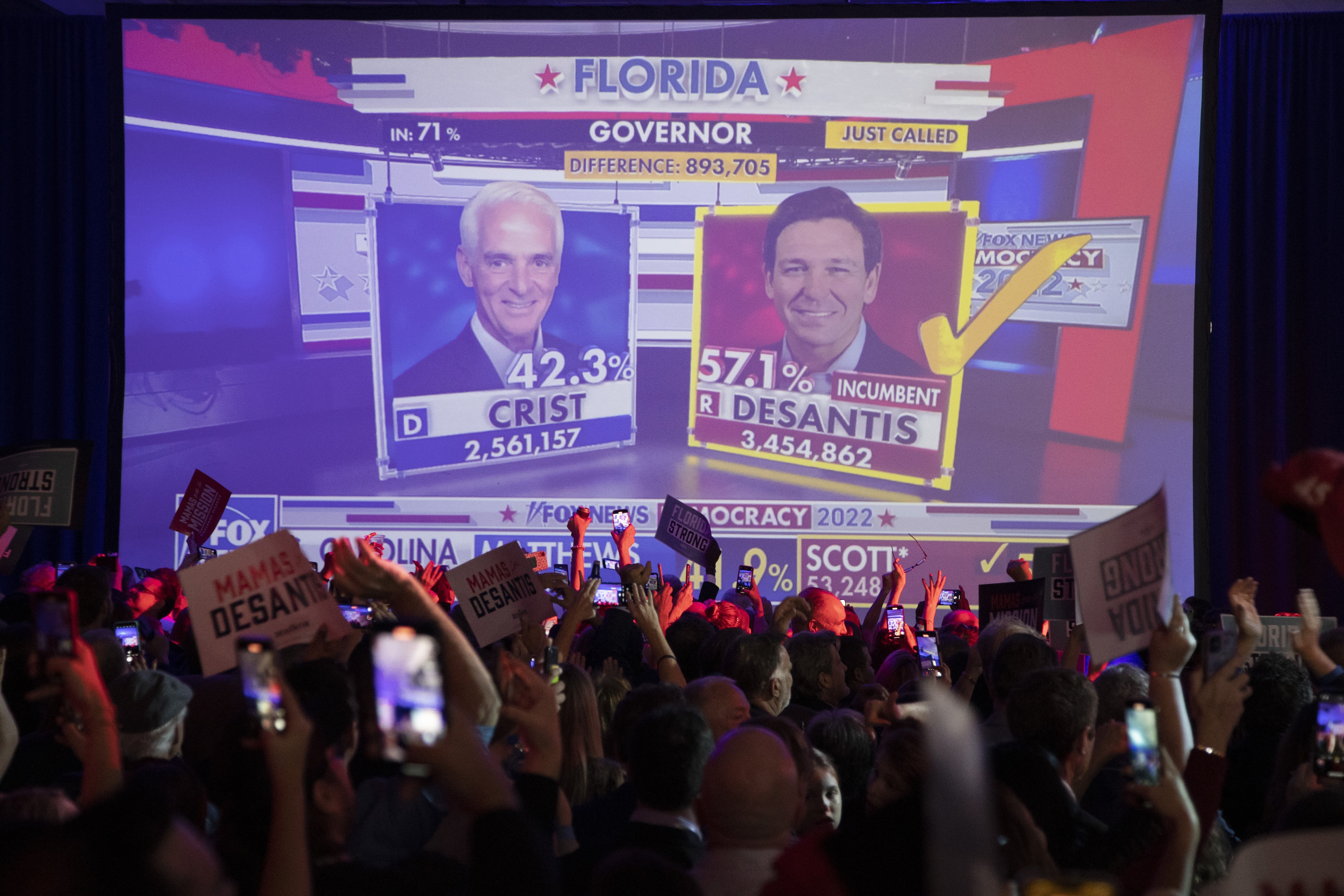 Ein Fernsehbildschirm zeigt den Gouverneur von Florida, Ron DeSantis, der während seiner Wahlparty im Tampa Convention Center als Sieger hervorgeht